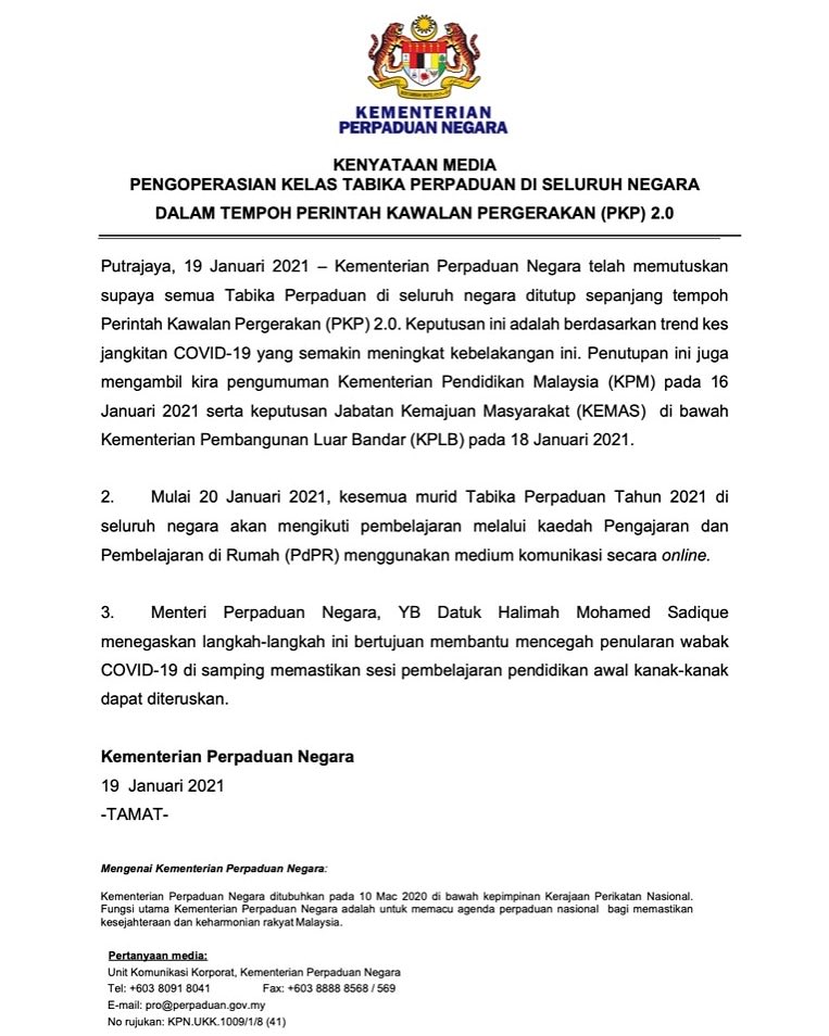 Pahangmedia On Twitter 19 Januari 2021 Kenyataan Media Pengoperasian Kelas Tabika Perpaduan Di Seluruh Negara Dalam Tempoh Perintah Kawalan Pergerakan Pkp 2 0 Https T Co Hd3qmgm5ui Twitter
